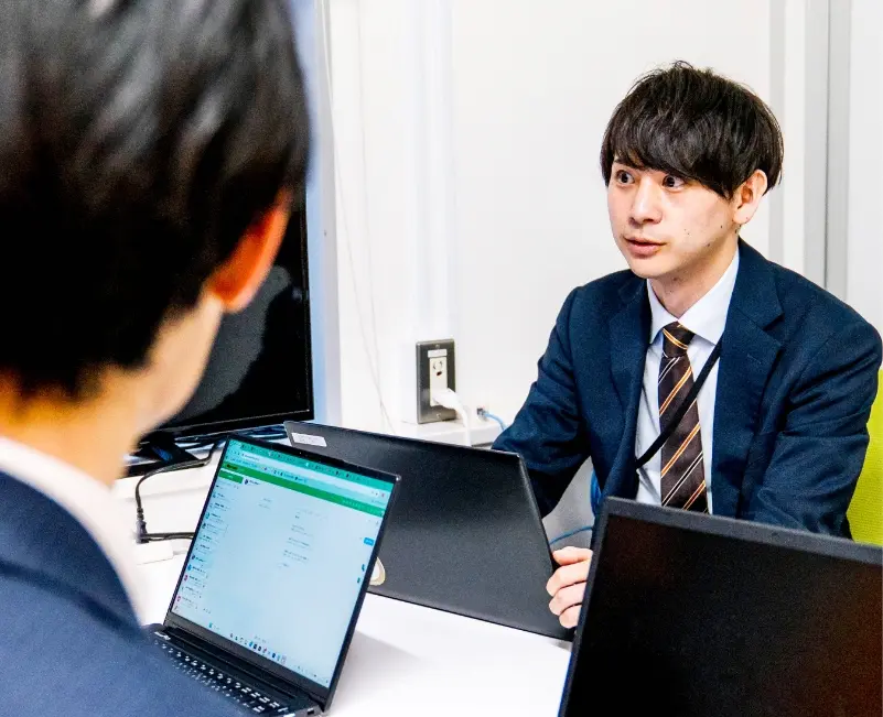 入社後の育成については、入社手続きや社内ルールの読み合わせ、各社内システムの設定等の入社ガイダンスの実施。商品理解、営業方法等についてもレクチャーしていきます。